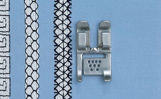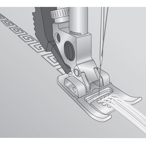 Fädeln Sie bis zu 9 Sticktwist-, Perl- oder Glanzgarne durch die ösenartige Führung des Fusses ein und übernähen Sie diese mit einem beliebigen Zier- oder Nutzstich. Nur für Maschinen mit Obertransport IDT.