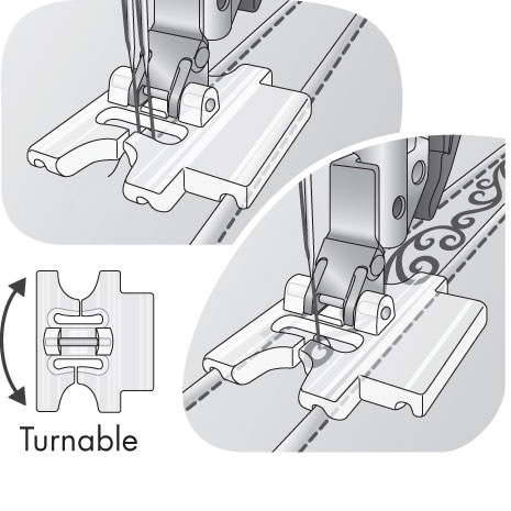 Mit diesem Nähfuss nähen Sie exakte Biesen mit einem Abstand von 5 bis 11 mm. Mit demselben Nähfuss nähen Sie in die Zwischenräume Zierstiche mit einer Breite von bis zu 6 oder 9 mm.