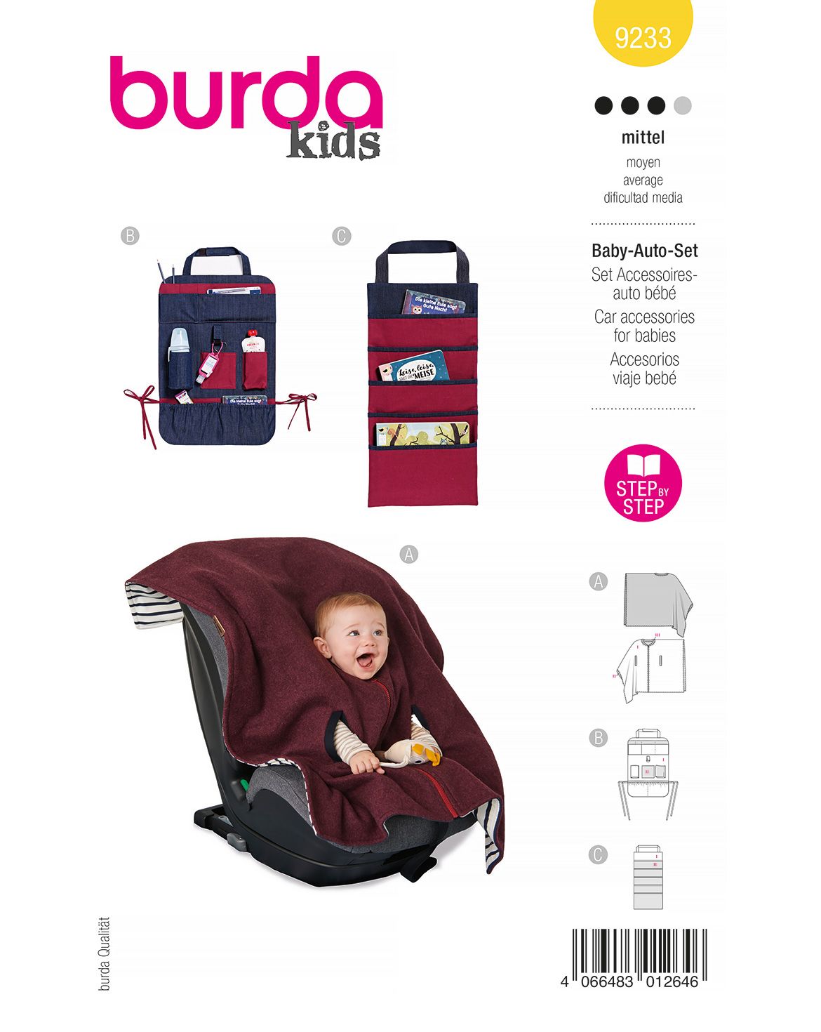 Bestens ausgerüstet im Auto ist der Nachwuchs mit diesen praktischen Accessoires. Der gefütterte Poncho A mit Ärmelschlitzen und Reißverschluss macht die Autofahrt komfortabel, weil er auch ohne Jacke schön warm hält und die Händchen frei sind. Die Utensilos B und C halten alles Notwendige auf der Fahrt bereit.