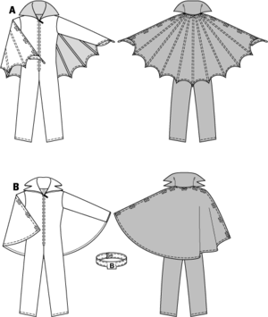 Overall jeweils mit Reißverschluss, großem Kragen und einem separaten Cape, das mit Klettband befestigt wird.