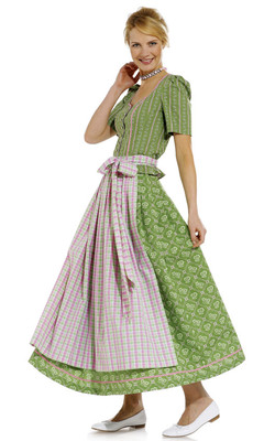 Zum typischen, in schmale Falten gelegten Rock mit Schürze können Sie ein Mieder mit passender Bluse oder eine Kurzarmbluse in Miederform tragen.