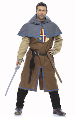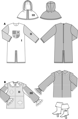 Modell A besteht aus einer geschlitzten Tunika mit aufgestepptem Wappen und Cape mit angeschnittener Kapuze.