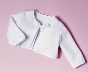 Das kuschelige Bolerojäckchen, wird an den Kanten eingefasst und mit Satinbändern geschlossen.