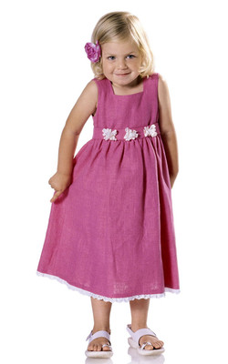 Ärmelloses Kleid (A) im Landhausstil mit Bindeband und kontrastfarbenen Blüten und Saumrüsche.