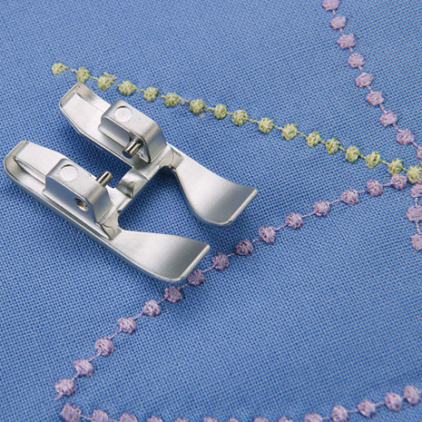 Der Candlewicking-Fuss mit IDT hat eine tiefe Rille an der Unterseite, um besser über voluminöse Stiche gleiten zu können.
