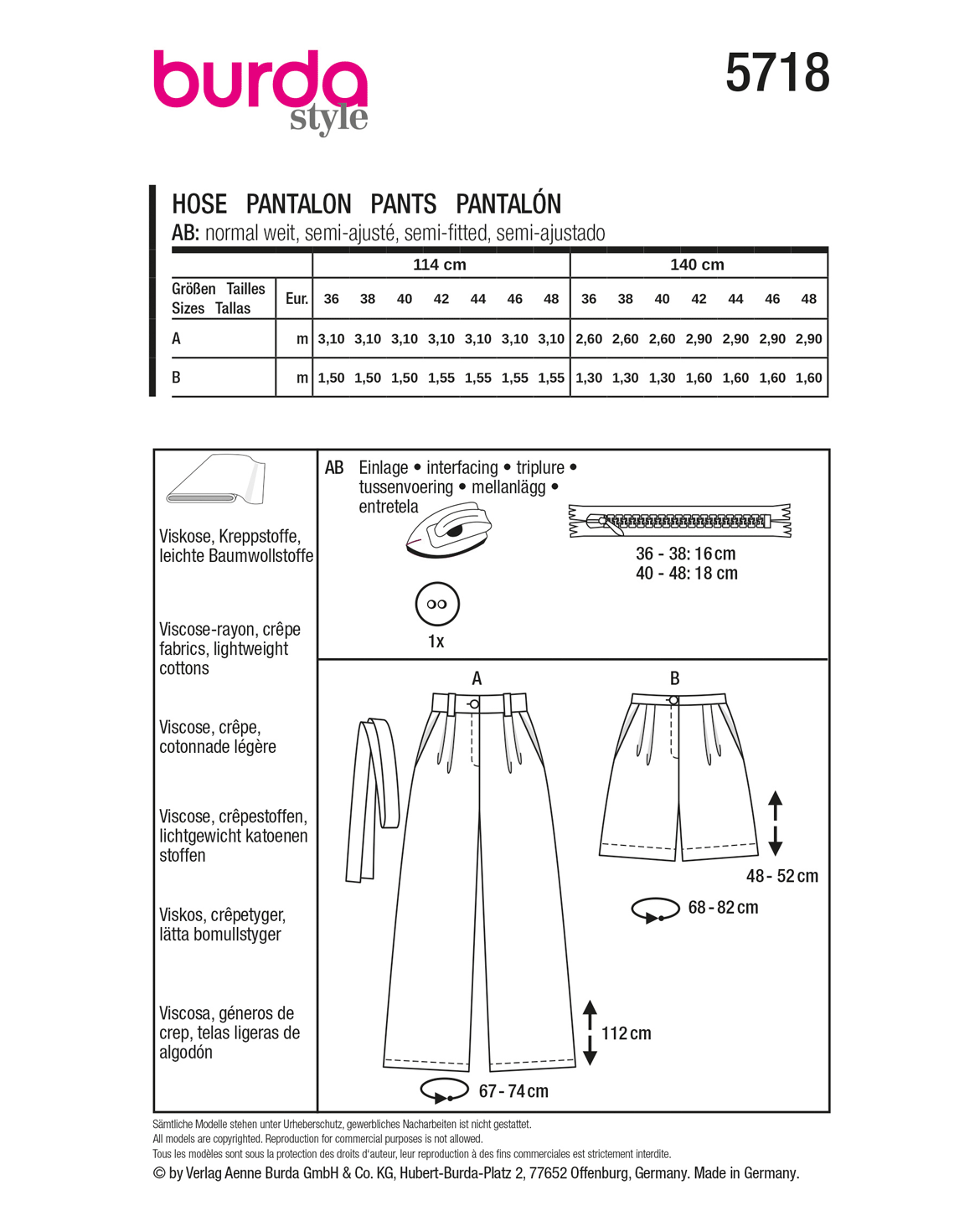 Dieses Hosen-Schnittmuster von burda style bietet zwei vielseitige Varianten für sommerliche Tage: Die weite Marlenehose mit Bundfalten und Hüftpassentaschen ist perfekt für formale Anlässe bei Hitze dank der kühlenden Viskose. Für einen entspannten Look gibt es die raffinierten Shorts mit Bundfalten und tiefen Taschen, die praktische Alternative zum Minirock. Ideal für fortgeschrittene Nähbegeisterte!