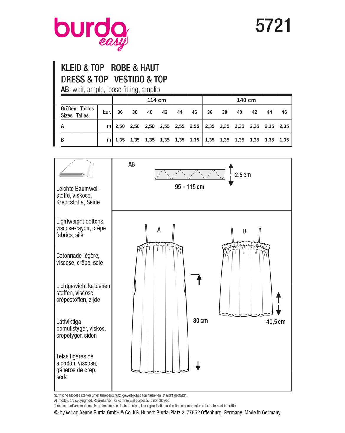 Dieses vielseitige Kleid- und Top-Schnittmuster von burda easy ist perfekt für Anfänger. Das Trägerkleid mit Nahttaschen passt sich mühelos jedem Anlass an ob als luftiger Strandbegleiter oder schick gestylt für eine Cocktailparty. Einfach kürzen oder verlängern, je nach Vorliebe! Die zweite Variante, ein Top mit gesmoktem Ausschnitt und Spaghettiträgern, ist schnell genäht und eignet sich für edle Seide oder leichte Sommerstoffe.