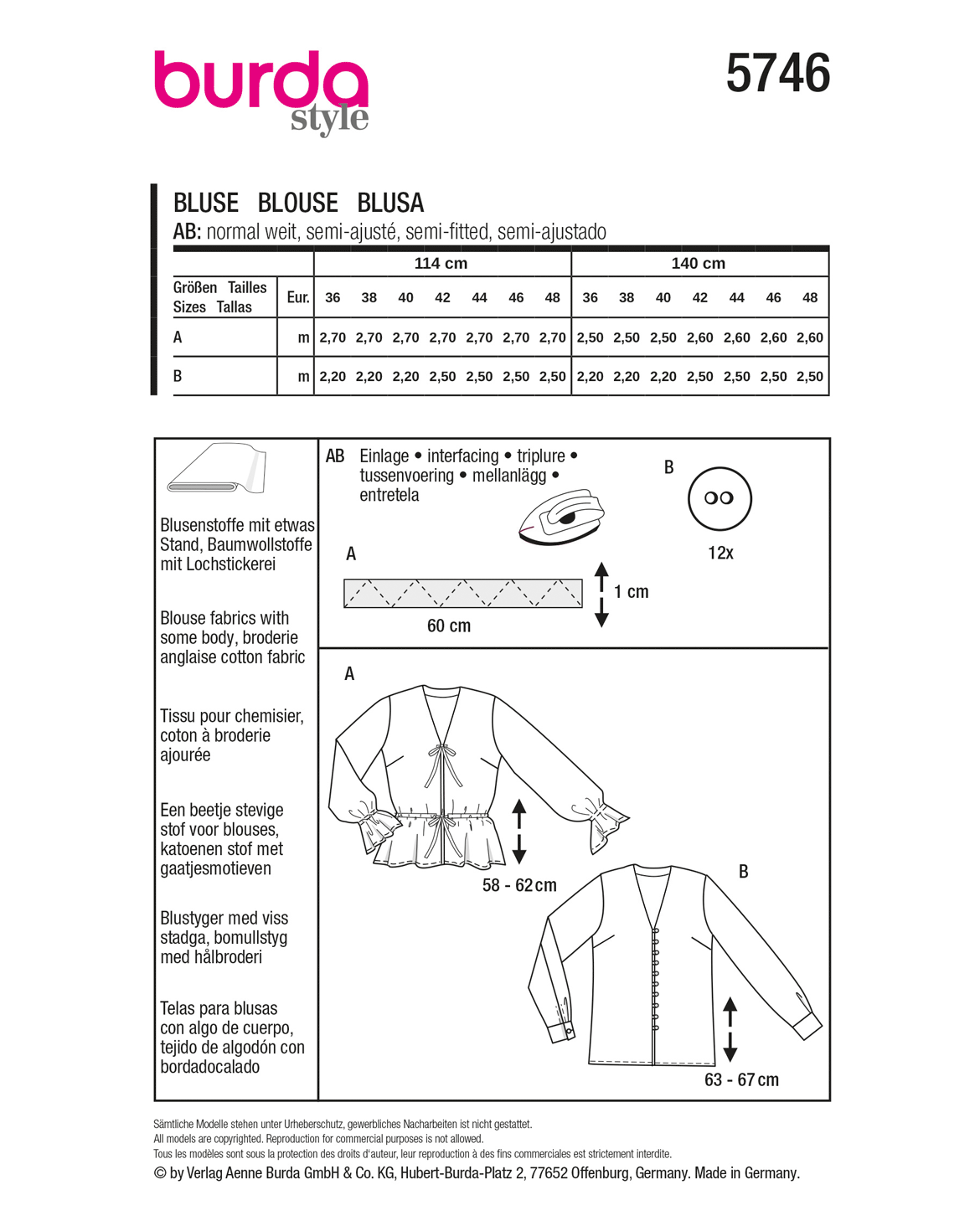Verleihe deinem Frühling einen Hauch von Eleganz mit diesem burda style Blusen-Schnittmuster! Die zwei Varianten bieten dir sowohl feminine als auch lässige Styles. Die erste Bluse überzeugt mit einem luftigen Schnitt und einem Gummizug, der eine Traumtaille zaubert. Zarte Bindebänder schließen das Modell, während die Rüschen an den Ärmeln ebenfalls durch einen Gummizug entstehen. Die zweite Variante vereint zarten Vintage-Print, eigens bezogene Knöpfe und einen cleanen Schnitt mit tiefem V-Ausschnitt perfekt für coole Streetstyle-Looks!