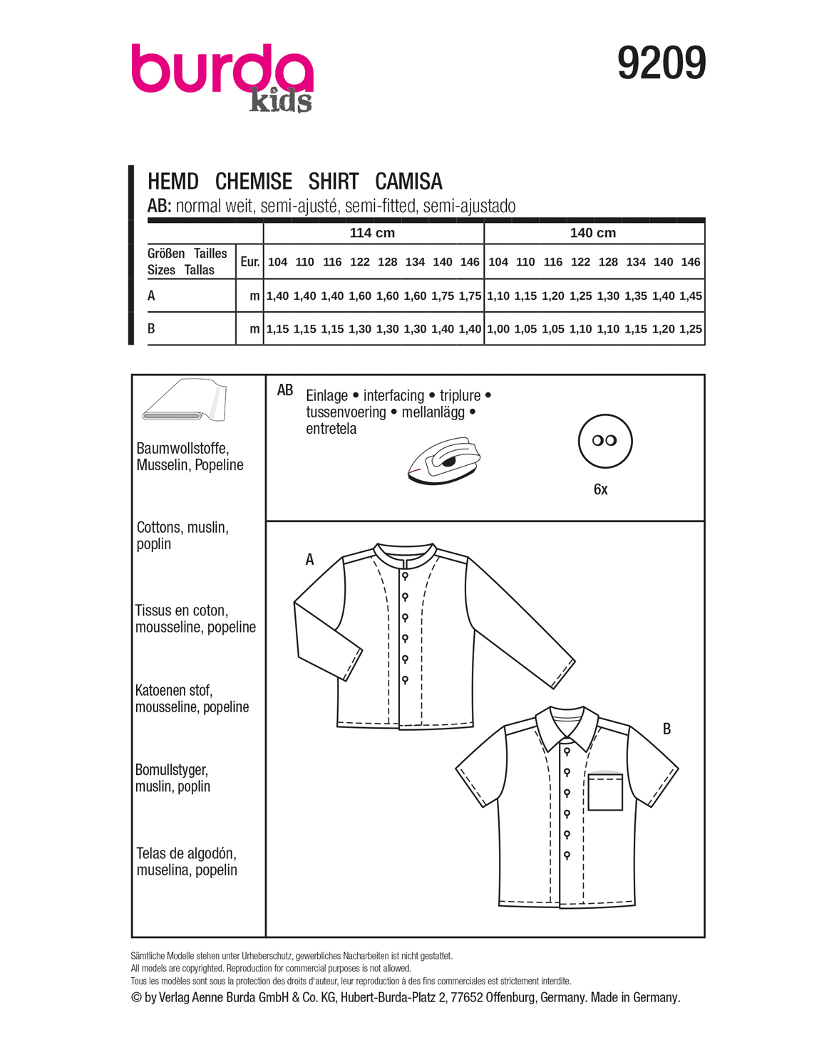 Mit diesem Hemd-Schnittmuster von burda kids kannst du zwei coole Varianten nähen ideal für Anfänger! Ob klassisch mit Stehkragen oder lässig als Kurzarmhemd mit Brusttasche, beide Designs überzeugen im Alltag. Dank des knitterfreien Bio-Musselins bleibt das Hemd immer schön in Form.