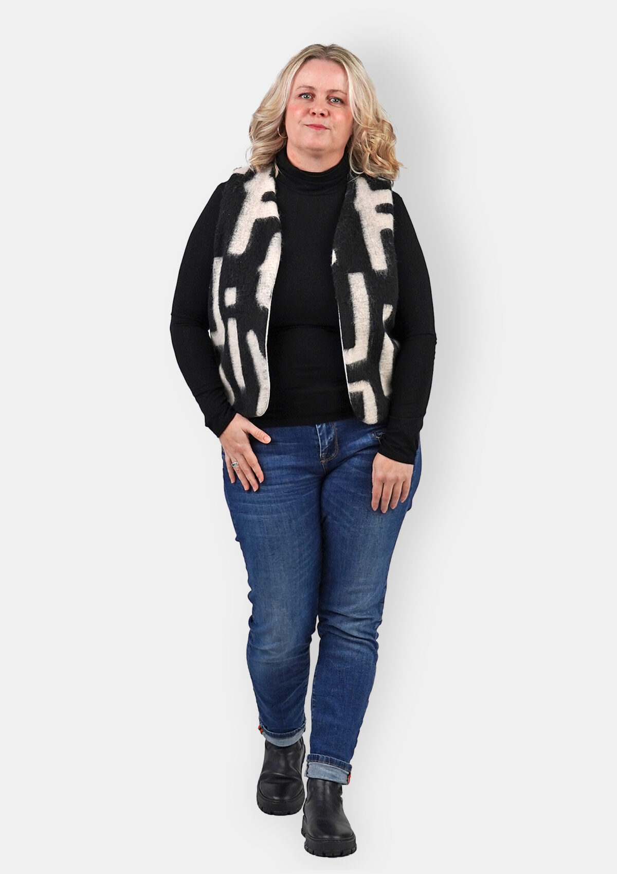 Die Basic-Weste ist schnell und einfach genäht und damit auch ein tolles Projekt für Anfänger und Einsteiger. Die Weste wird offen getragen und rundherum mit Schrägband eingefasst. Du kannst sie aber auch mit Futter nähen in diesem Fall ist sogar eine Wendevariante möglich, sodass du je nach Tagesform mal die eine, mal die andere Seite außen tragen kannst. Die optionale Teilungsmöglichkeit im Vorderteil verleiht deiner Weste noch ein bisschen mehr Pfiff. Bei der Stoffwahl bist du völlig frei. Wie wäre es zum Beispiel mit einem coolen Statement-Teil aus zotteligem Plüschstoff? Natürlich kannst du dich aber auch für einen schlichteren Look entscheiden ganz, wie es dir gefällt.