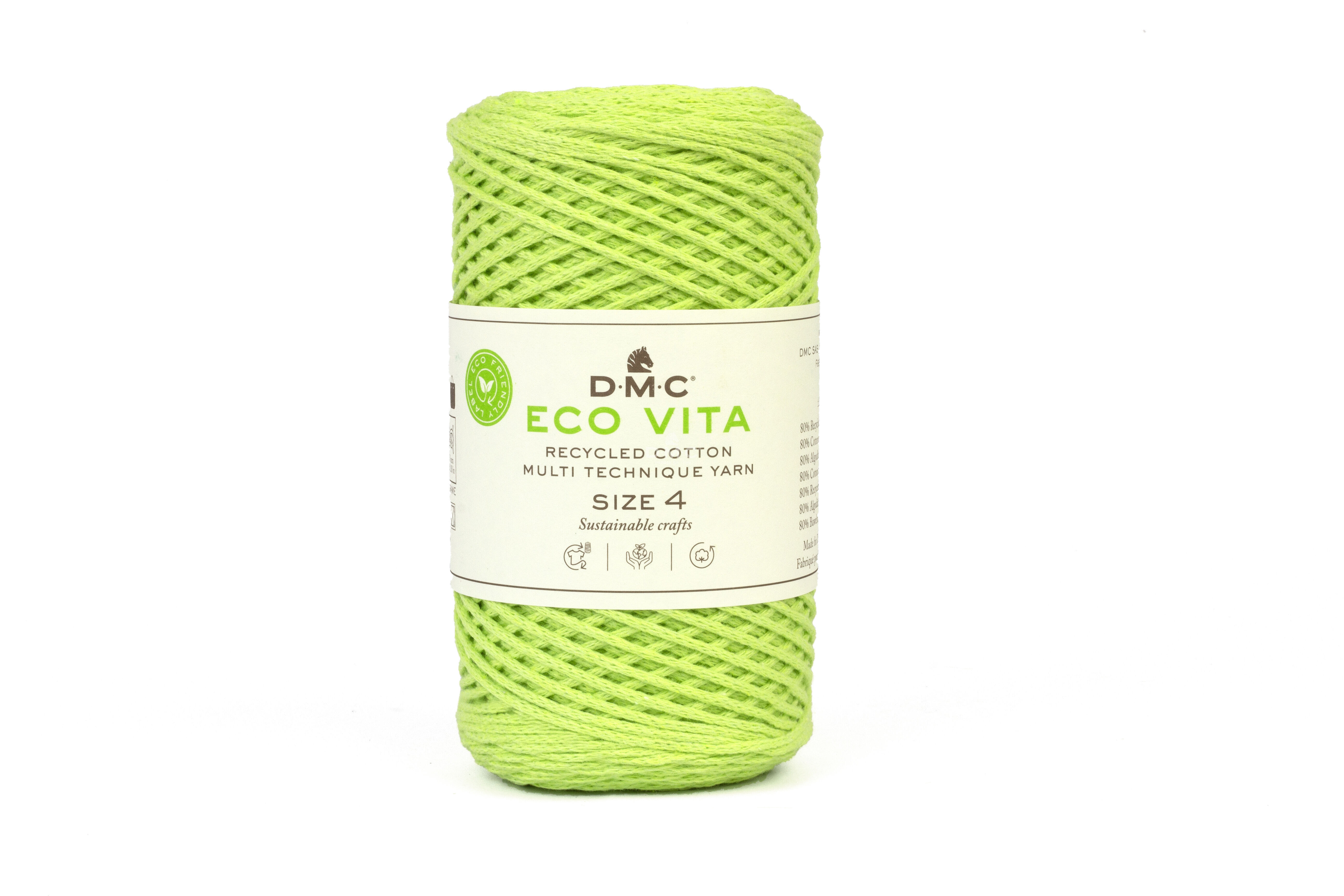 Eco Vita 4 ist ein dickes, schlauchförmiges Garn aus recycelter Baumwolle, das sich perfekt für Makramee, Strick- oder Häkelarbeiten eignet, wie z. B. Körbe, Blumentöpfe, Kissen oder Lampenschirme.