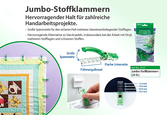 - Grosse Spannweite für den sicheren Halt mehrerer übereinanderliegenden Stofflagen.
