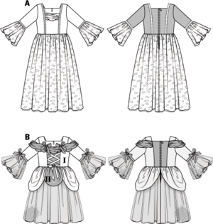 B wadenlanges Tanzkleid mit geraffter Ausschnitt- und Schulterblende, Bandverzierung und Hüftdrapees.