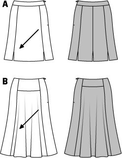 Sieben leicht ausgestellte Rockbahnen und der Formbund ergeben Rock A in knieumspielter Länge.