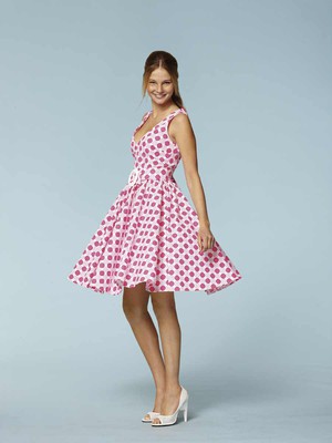 Das figurbetonende Oberteil und der weite, gekräuselte Tellerrock erinnern an den Stil der 1950er Jahre!
