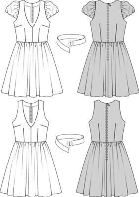 Kleid A hat hübsche kurze Ärmel, gefüttert und mit Gummiband gerafft.