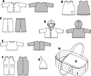 Jacke, Shirt, Kleid, Hose, Overall und Mütze - dazu die tolle Baby-Tragetasche.