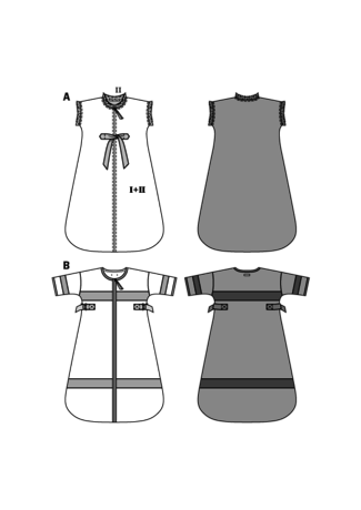 A ohne Ärmel, mit Bindebändern und Rüschen verziert.