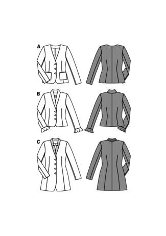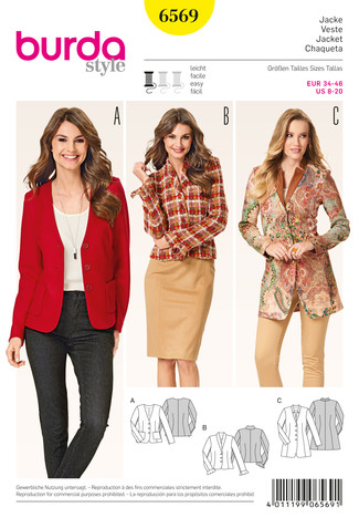Drei klassische, körpernahe Jacken, unterschiedlich interpretiert. Entweder sportlich mit V-Ausschnitt, feminin in verkürzter Form mit Kragenblende und Ärmelvolants oder im Boho-Style mit abgesetzen kleinen Revers