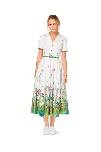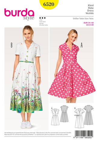 Hemdblusenkleider neu interpretiert. Beide Kleider mit Reverskragen, bis zur Taille geknöpft, mit in Falten gelegtem Rock in zwei Längen. Kleid A mit Ärmelblende, B mit kurzen Aufschlagärmeln und schmalem Gürtel.