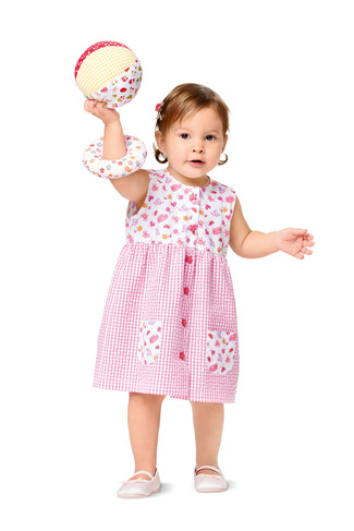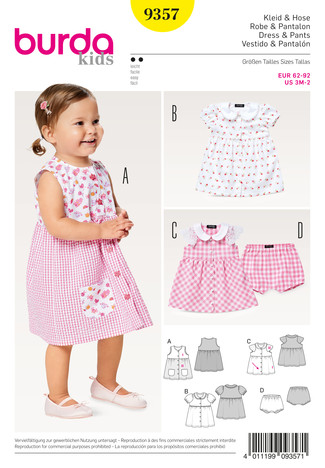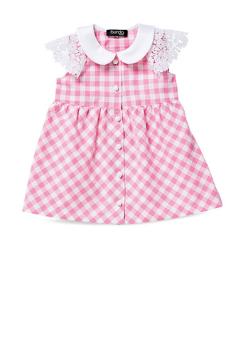 Luftige Sommerkleidchen mit eingereihtem Rock und Knopfverschluss. A ärmellos mit rundem Ausschnitt, BC mit Bubikragen und zweierlei Ärmelvarianten. Passend dazu das kurze Gummizughöschen.