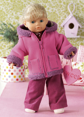 Schicke Outfits für Puppen: Vom Kostüm bis zum Ballkleid mit Bolero, von der Hose bis zur Winterjacke, dazu auch noch die passende Kopfbedeckung.