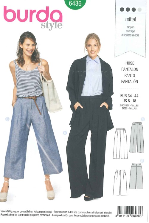Bei den Stoffhosen machen weite Formen, teilweise in maskuliner Optik, das Rennen. Hier ein Klassiker mit Formbund, schrägen Eingrifftaschen und Bundfalte. A lang mit Bügelfalte, B in Culotte-Länge, rundgebügelt.
