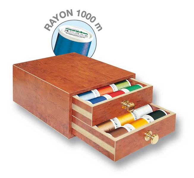 1000m-Rayon-Stickgarne in den Hauptfarben sind in 2 herausnehmbaren Schubladen angeordnet. Jede Farbe hat ihren eigenen Platzhalter mit Farbnummer und Farberkennung.