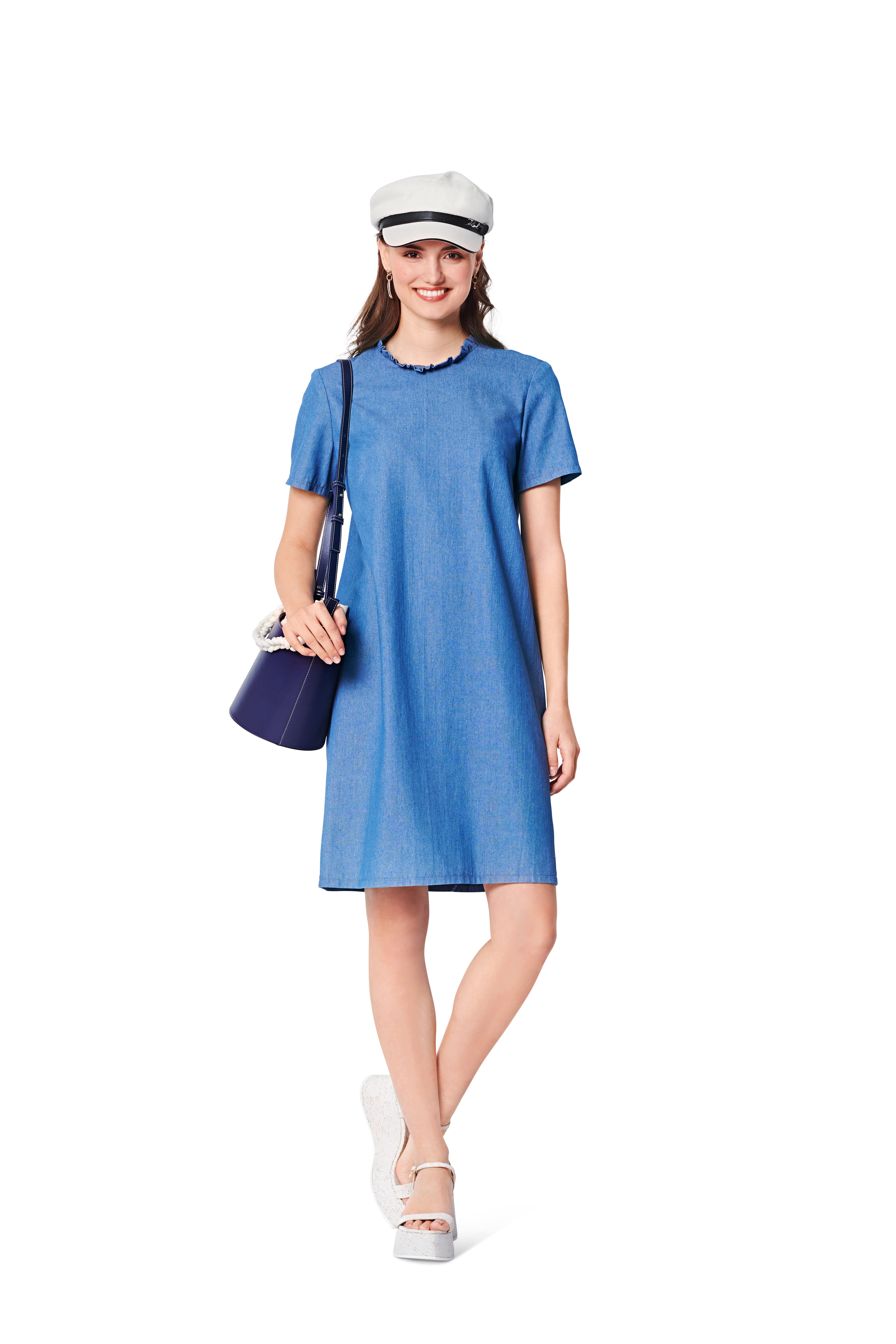 Das schöne Kleid im Denim Look ist ein wahrer Hingucker und dabei super bequem. Die Verzierungen am Halsausschnitt geben dem Kleid das gewisse Etwas. Wenn Du mehr Interesse an einer Bluse hast, kannst du es auch wie in der Variante B nähen.