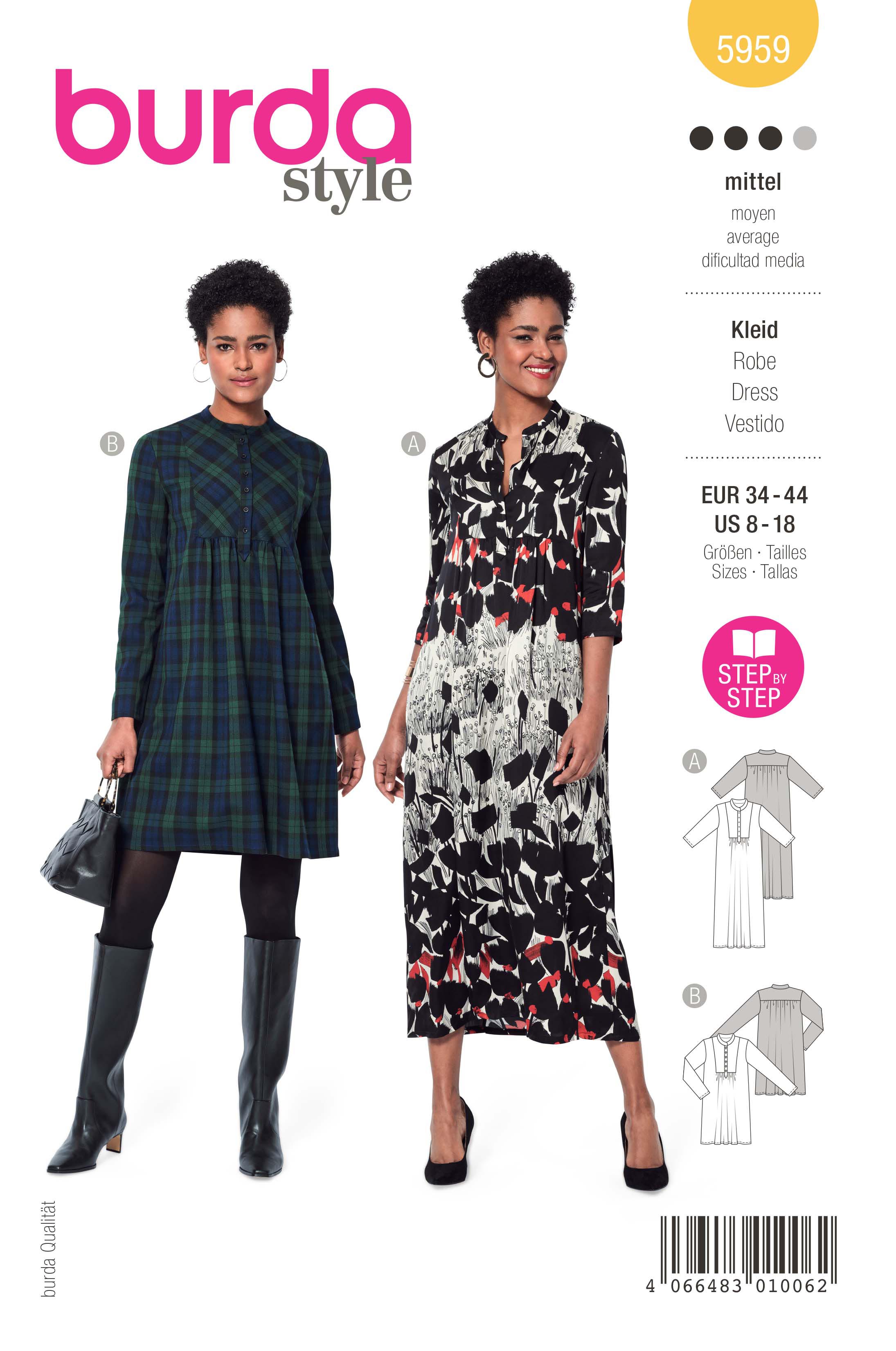 Bei diesen angesagten Kleidern macht die Länge den Look. A in Midi-Länge und 3/4 Ärmeln. B kommt als moderater Mini mit langen Ärmeln gut zur Geltung. Durch das gekräuselte Vorder- und Rückenteil ergibt sich eine Saumweite, die genügend Bewegungsspielraum ermöglicht. Der Eyecatcher ist jedoch der Einsatz mit Blende am Vorderteil und der Stehkragen.