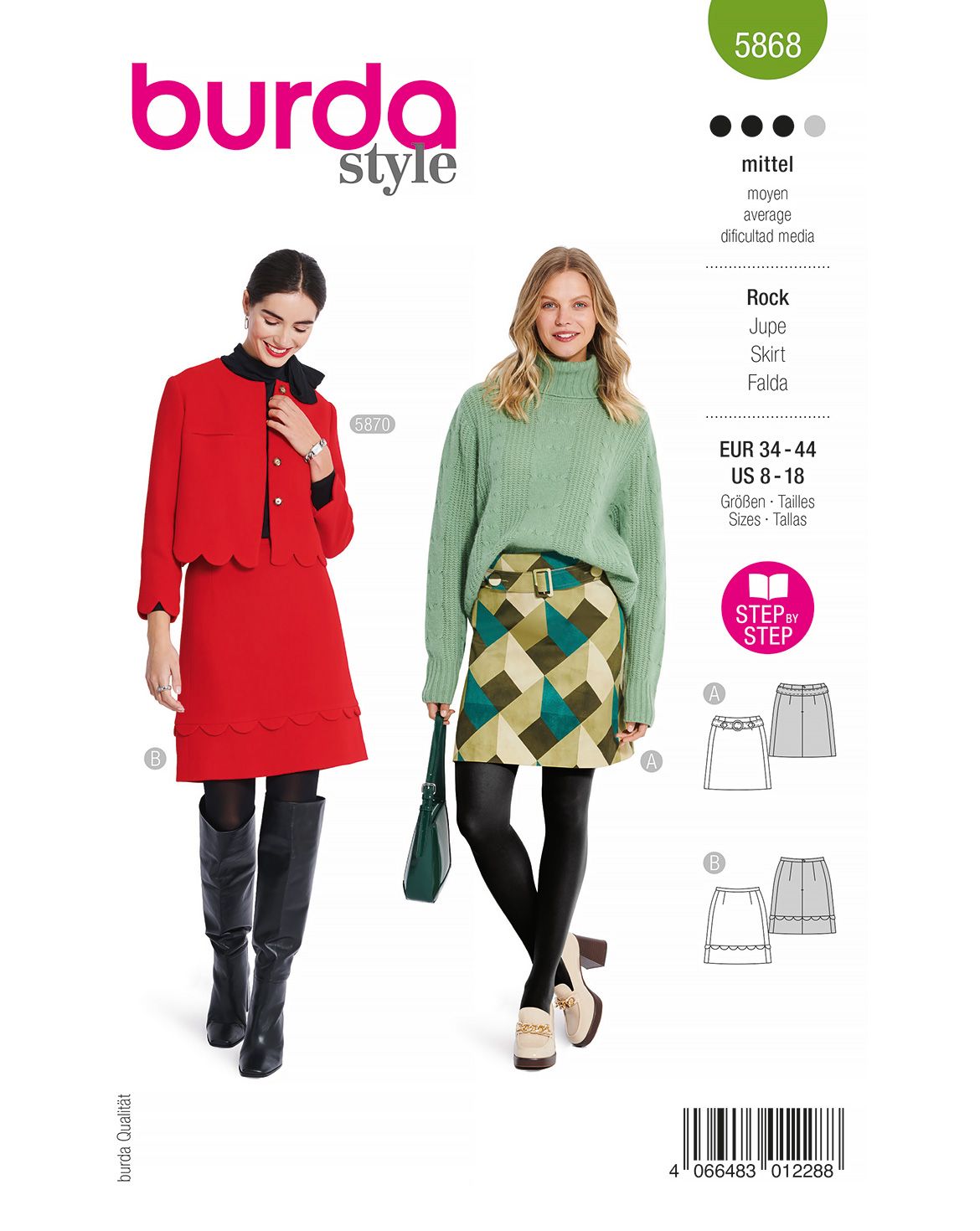 A mit dekorativem Formgürtel und Zierknöpfen. B mit schmalem Bund und hübscher Zierblende mit Bogenkante, die einfach in der Naht zwischengefasst wird. Tipp: mit dem passenden Jäckchen (Schnitt 5870) wird ein schickes Kostüm daraus.