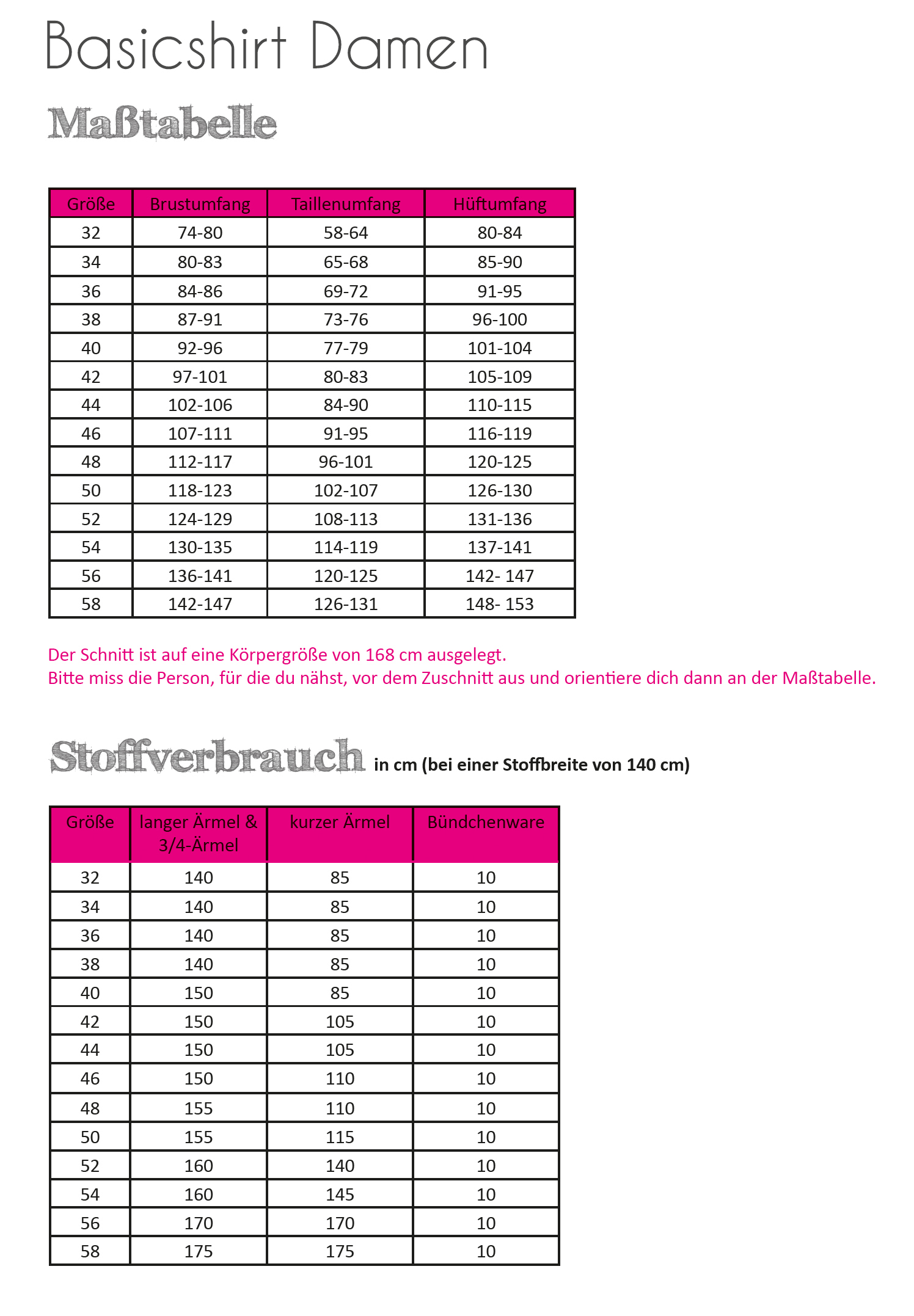 Das Basicshirt ist ein weiterer Basicschnitt, der deiner Kreativität keine Grenzen setzt. Der Schnitt enthält drei verschiedene Armvarianten und zwei unterschiedliche Halsabschlüsse (Rundhals- und V-Ausschnitt). Wähle zwischen taillierter oder gerader Form.