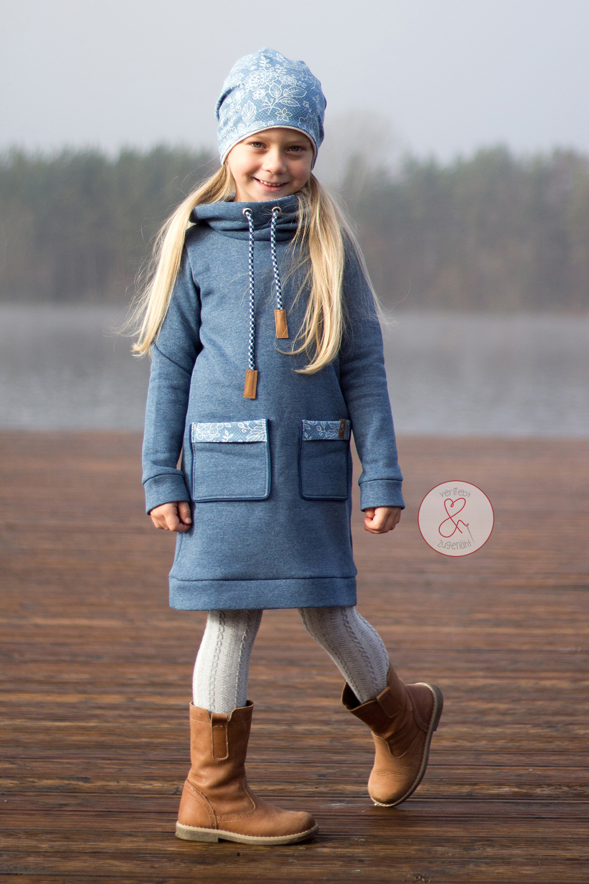 Was anspruchsvoll aussieht, ist in Wirklichkeit einfach genäht.Das Kleid kann aus Sweat oder auch Jersey genäht werden.