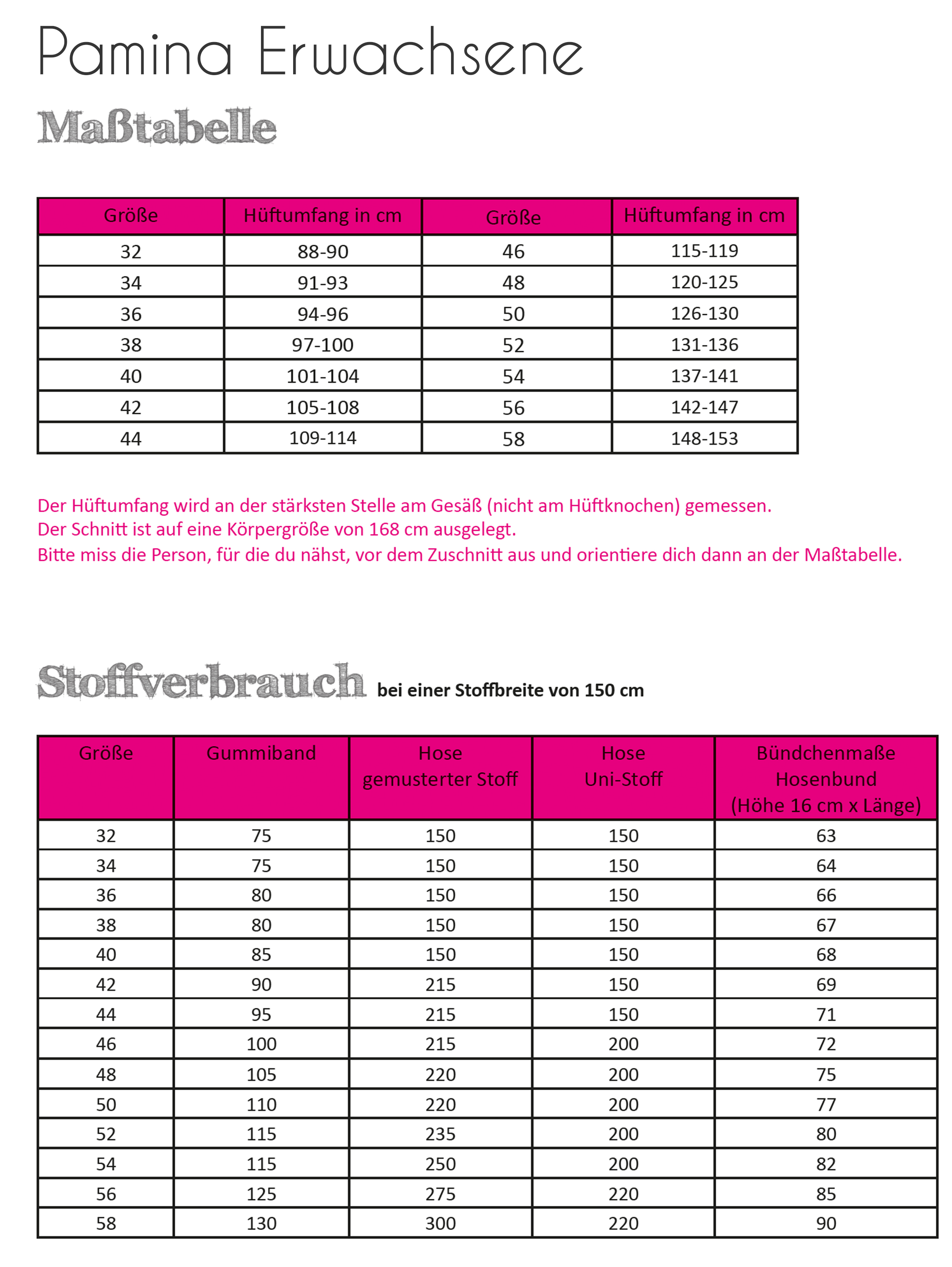 Die Hose Pamina kann aus verschiedenen Stoffen genäht werden. Besonders gut eignen sich Viskose, Seide oder dünner Stretchjersey, leicht fließende Webware, Viskose oder Voile. Die Eingriffstaschen können nach Bedarf weggelassen werden. Ein Basicschnitt, der euer Kreativität keine Grenzen setzt. Schnell und einfach genäht und mit einer Anleitung im Gepäck, sollten auch Anfänger keine Probleme haben.