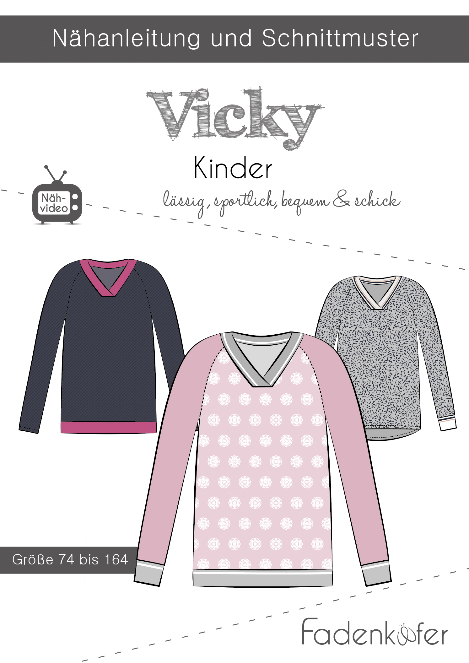 Was anspruchsvoll aussieht, ist in Wirklichkeit einfach genäht. V-Ausschnitte sind echte Klassiker. Bei diesem Pullover kannst du dich mit einem dezenten Stoff für einen zeitlosen Look entscheiden oder aber für tolle Kontraste mit Mustern und Farben. Besonders gut eignen sich farbenfrohe Cuff Me-Bündchen, um dem Pulli das besondere Etwas zu verleihen. Ob als Basic oder als neues Lieblingsteil – Vicky sollte in keinem Kleiderschrank fehlen.